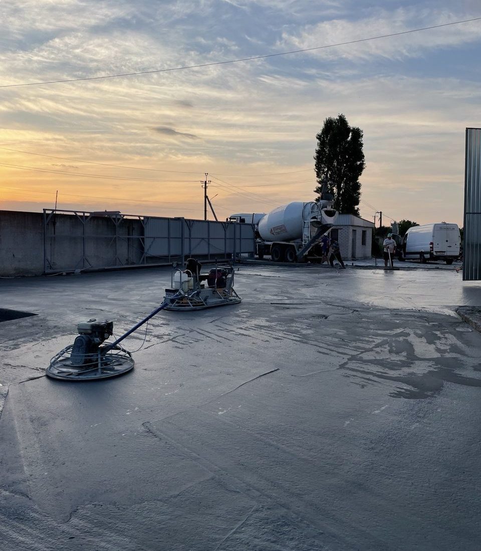 Рівномірне розподілення бетонної суміші по великій площі за допомогою промислових машин і механізмів для високої продуктивності та якості.